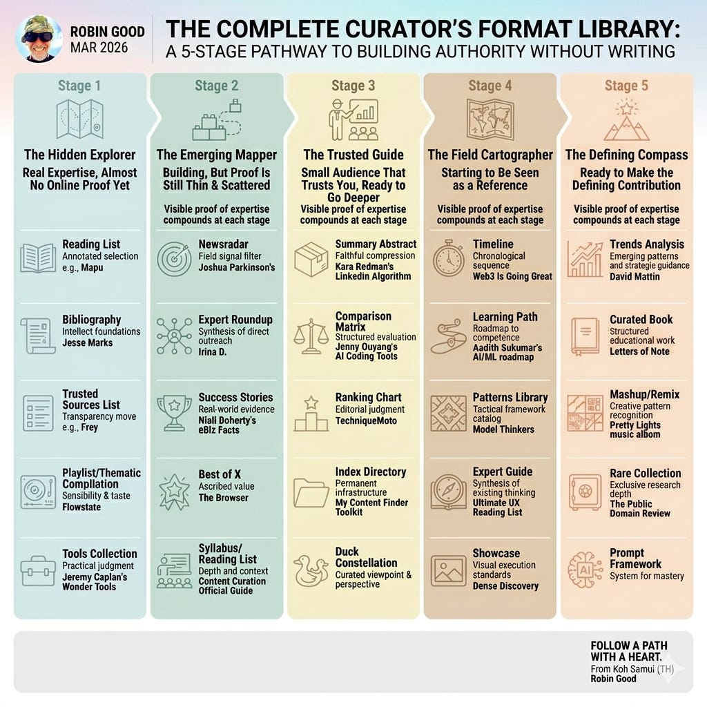 Una compilación temática bien estructurada revela tu sensibilidad. Las elecciones que haces, el orden en que colocas las cosas y las conexiones que estableces entre materiales dispares les dicen a los lectores quién eres como pensador y creador de tendencias de una manera que una lista o un directorio jamás podrían. Los lectores que conectan con tus compilaciones no solo confían en tus recomendaciones: confían en tu forma de ver las cosas.