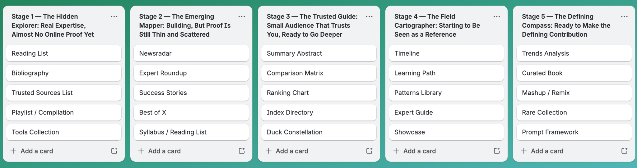 d) A continuación, creé una estructura simple de 5 columnas en Trello, donde cada columna representaba un nivel de autoridad, y procedí a asignar visualmente cada formato seleccionado a uno de esos 5 niveles. Esto fue una novedad. Se trataba de evaluar qué formatos seleccionados son más apropiados para expertos que recién comienzan en el mundo digital, así como cuáles son más complejos, difíciles y desafiantes, y se adaptan mejor a las necesidades de quienes ya tienen experiencia.